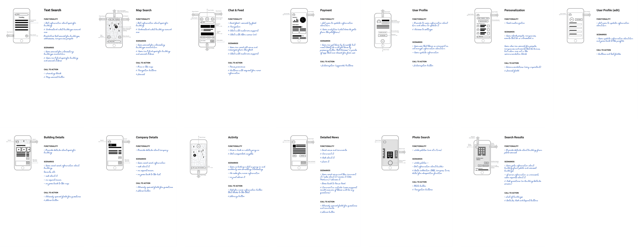 The next step was to get a rough understanding of the content of the main screens. I made a simple template and described all the screens using it.