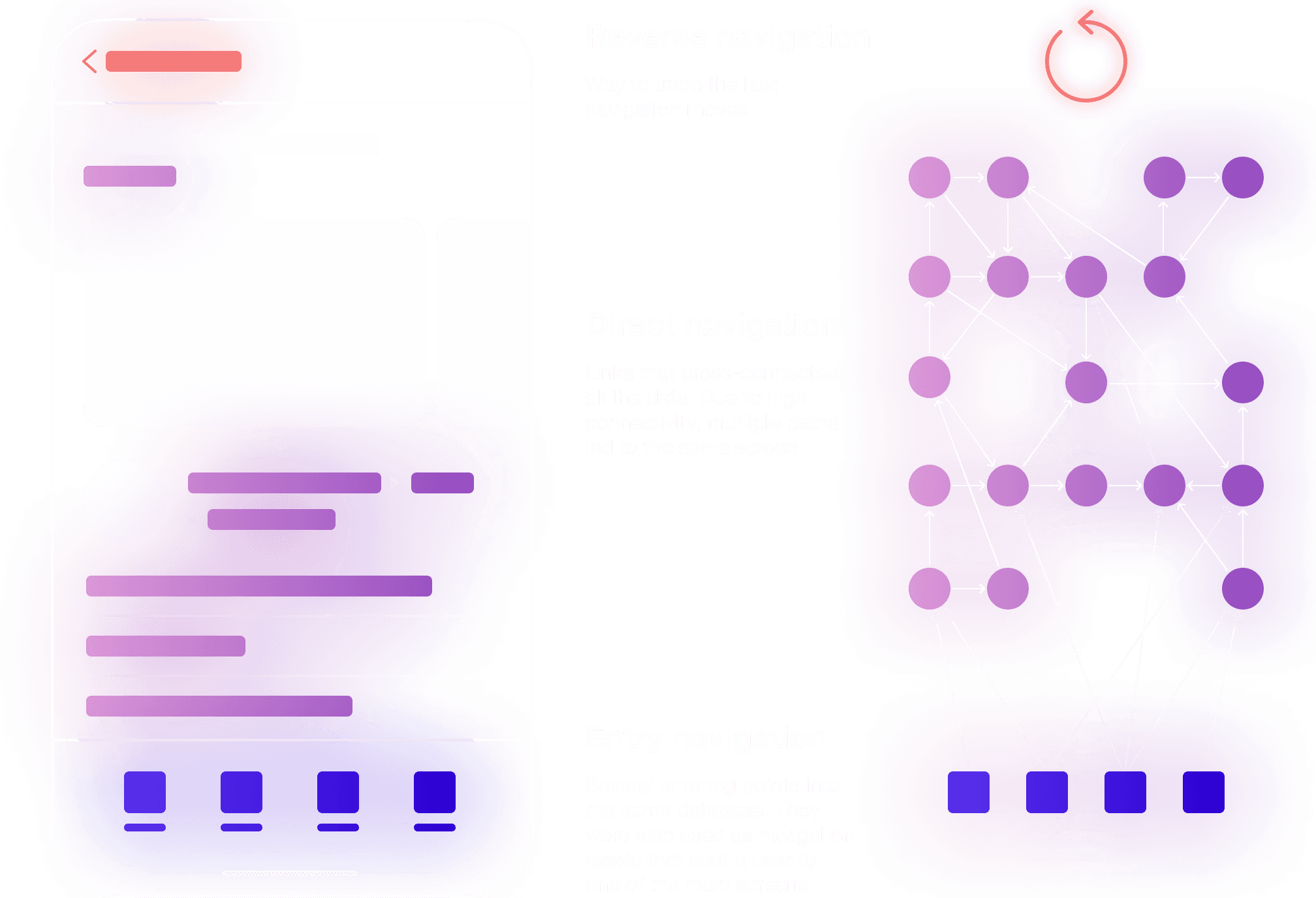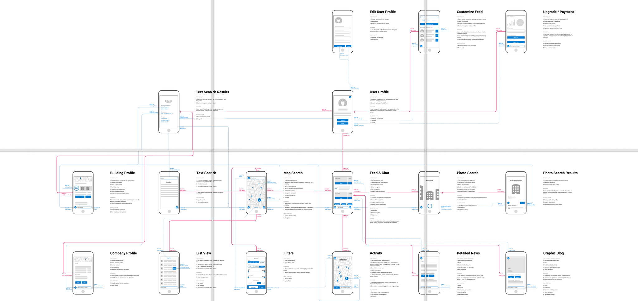 The system had many interconnected nodes and a few entry points (news feed, map, text search). Users were supposed to surf through data seamlessly without needing to return to the point where they started. The standard iOS navigation with "hyperlinks" seemed perfect for this case.