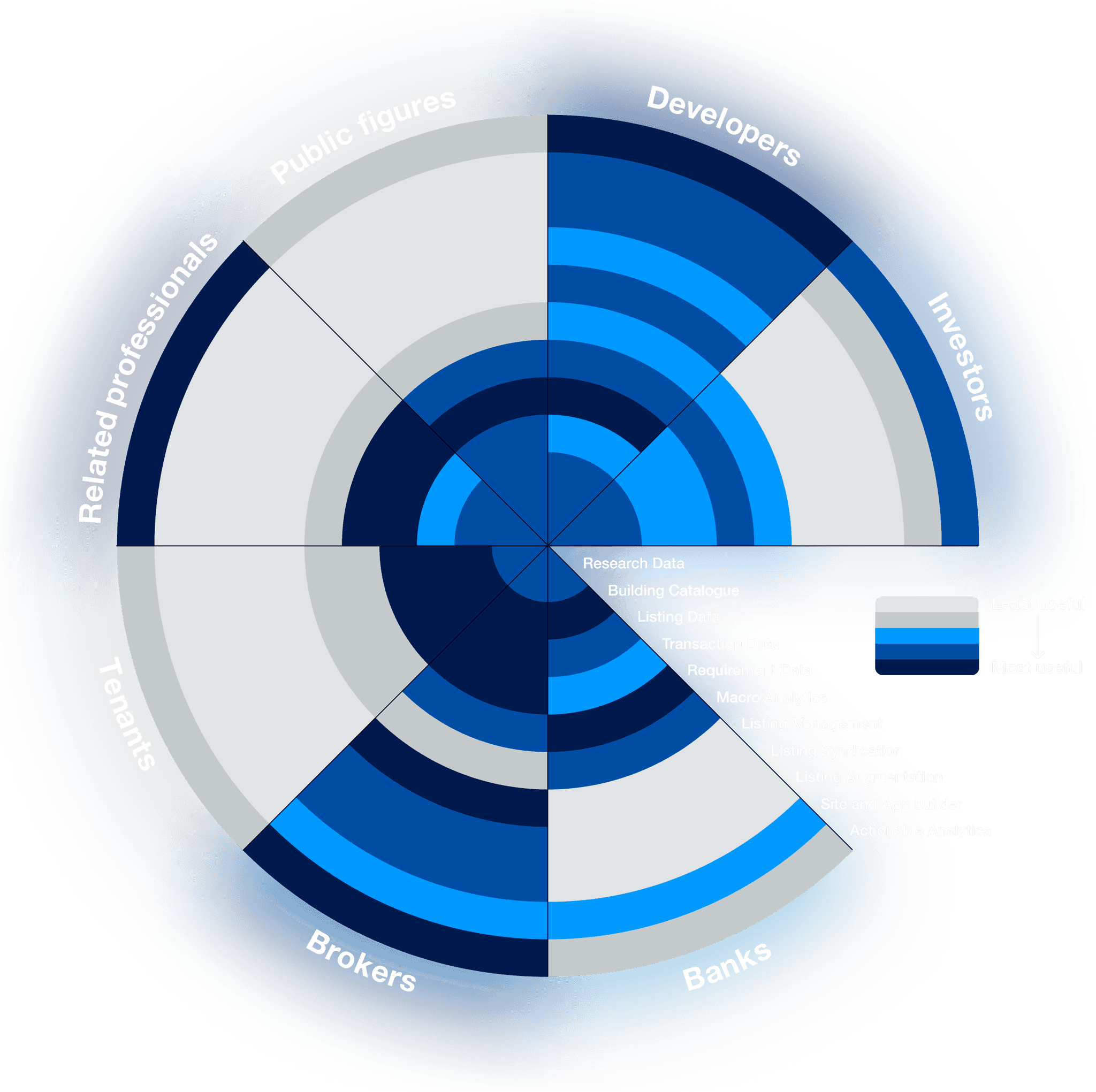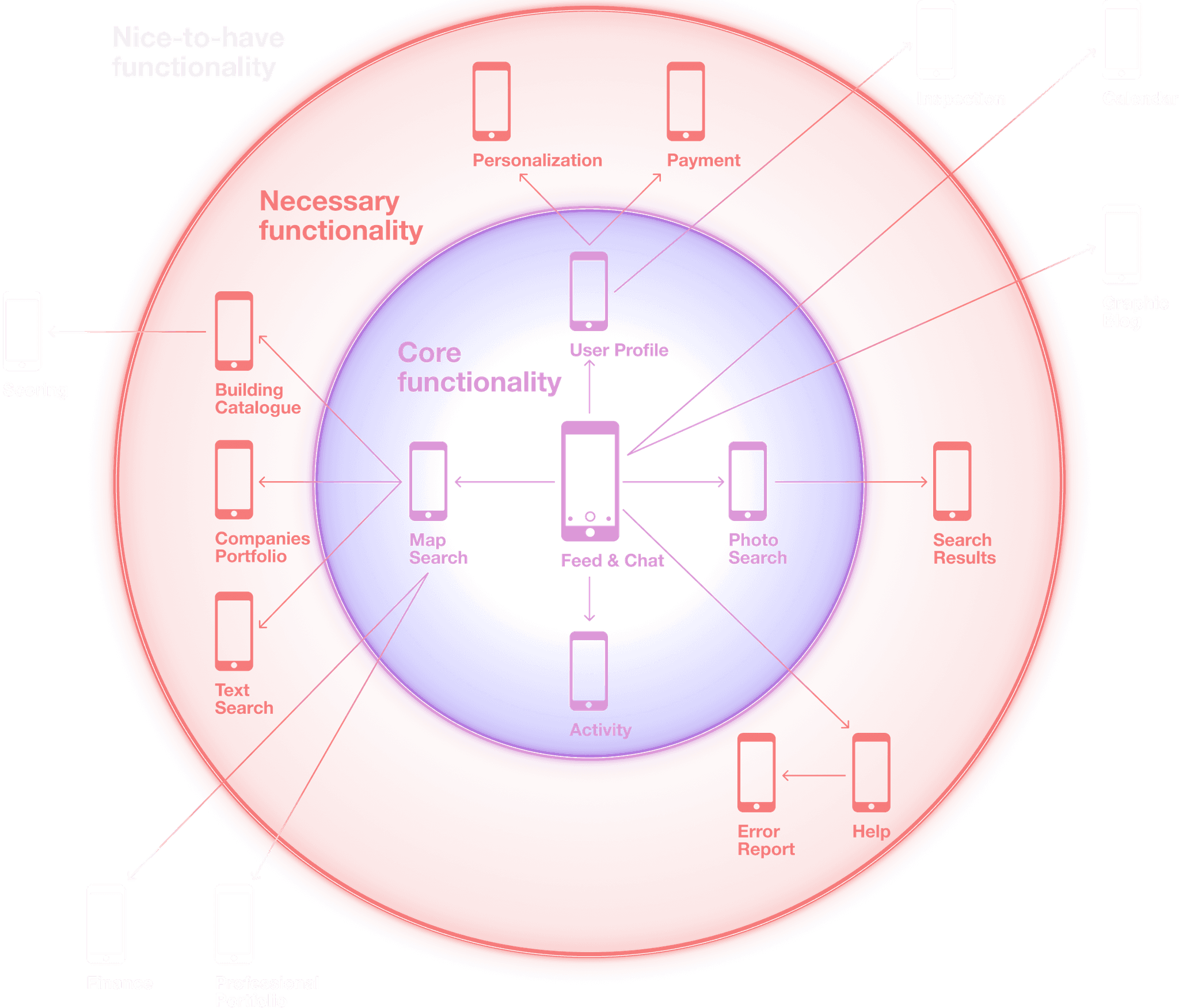 Among our potential users were everybody who was somehow connected to the commercial real estate market. Creating a service from scratch for such a wide range of users is impossible. So, after a series of interviews, I made a diagram of the service's usefulness for different categories.