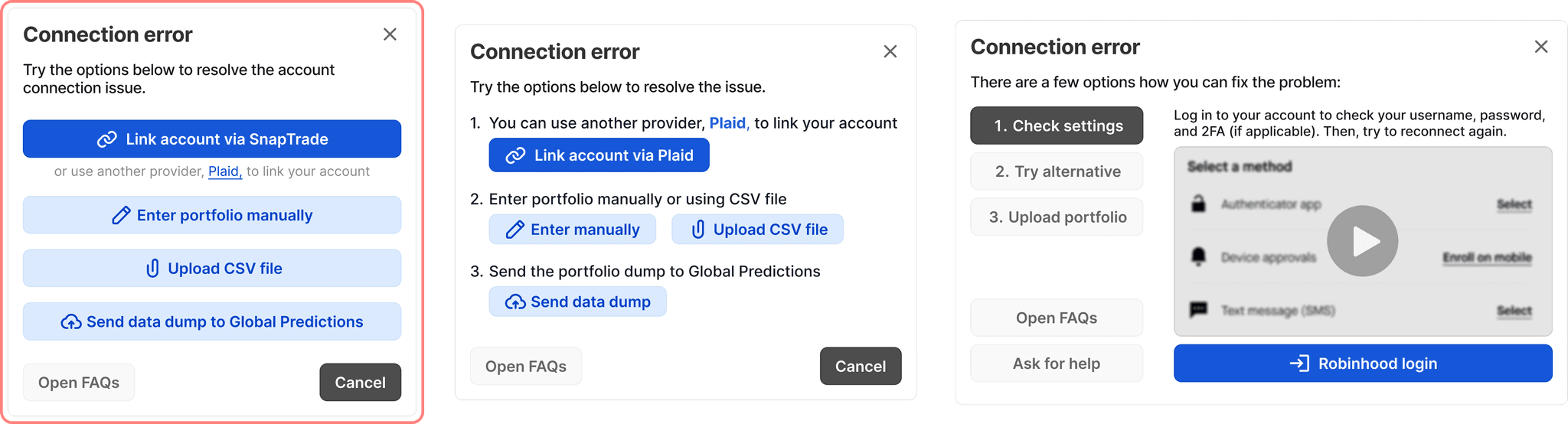 Actually, connection errors were only a part of a larger scope of various issues that prevented a user from connecting a portfolio: