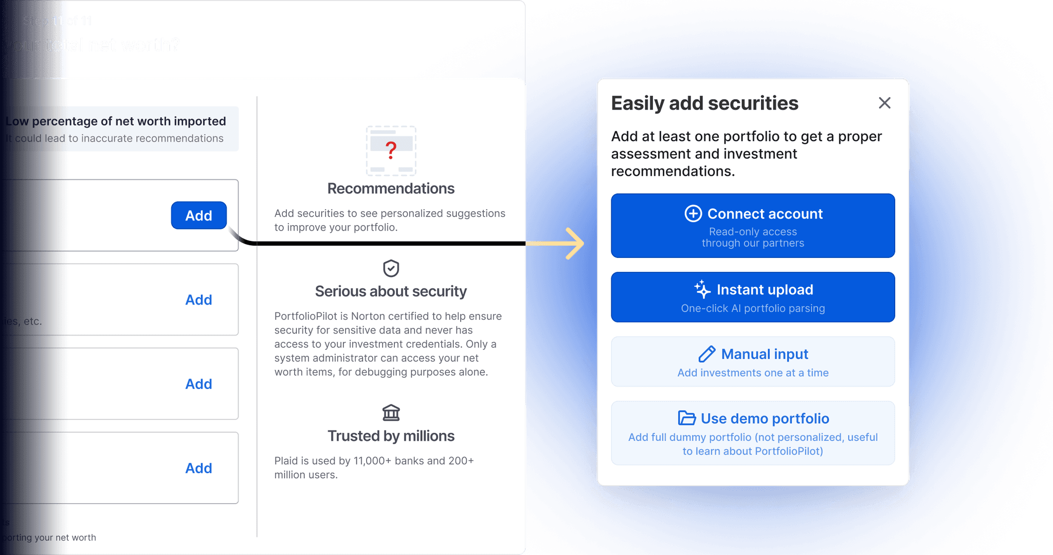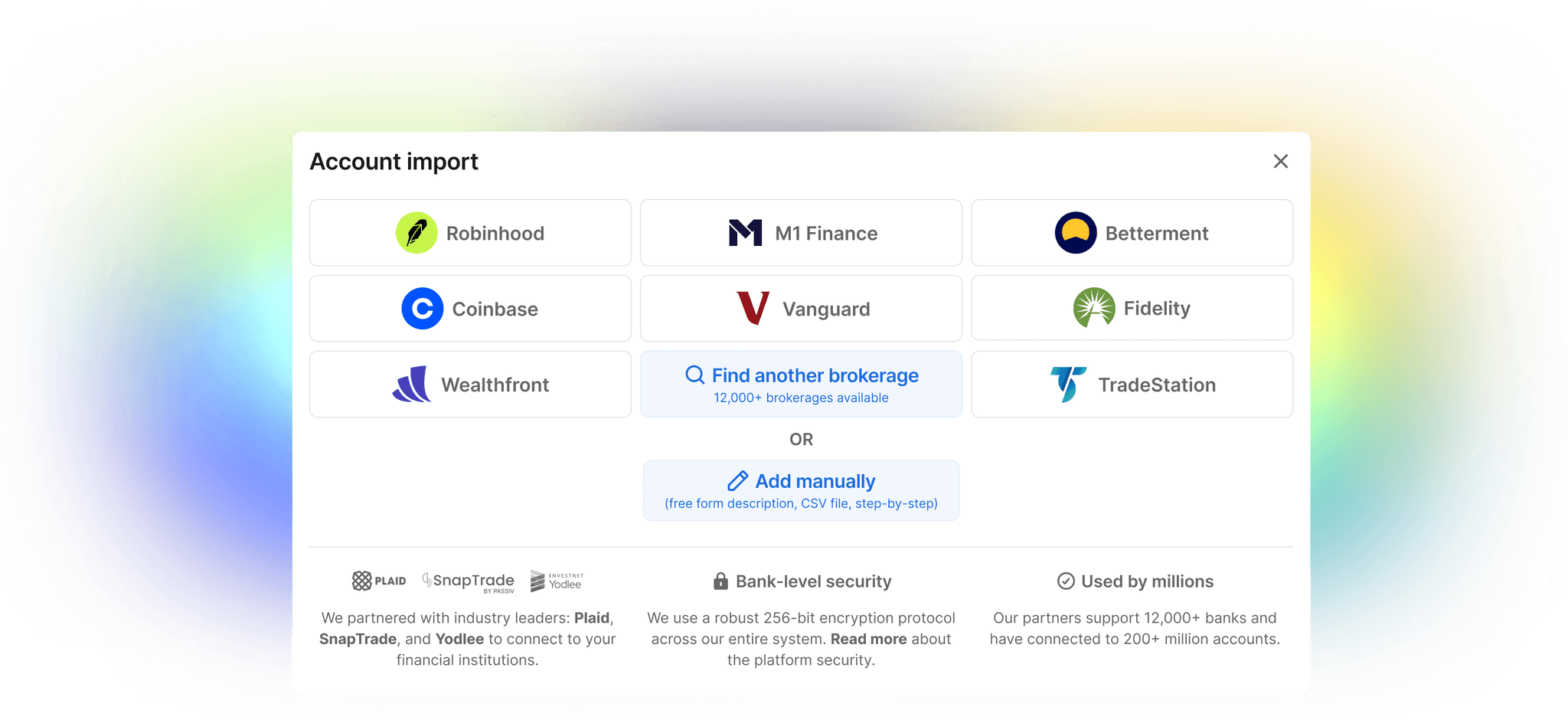 Connecting to users’ investment accounts was essential for the system. Imagine you have 50 securities and make trades every month. It would be painful to update this information manually.