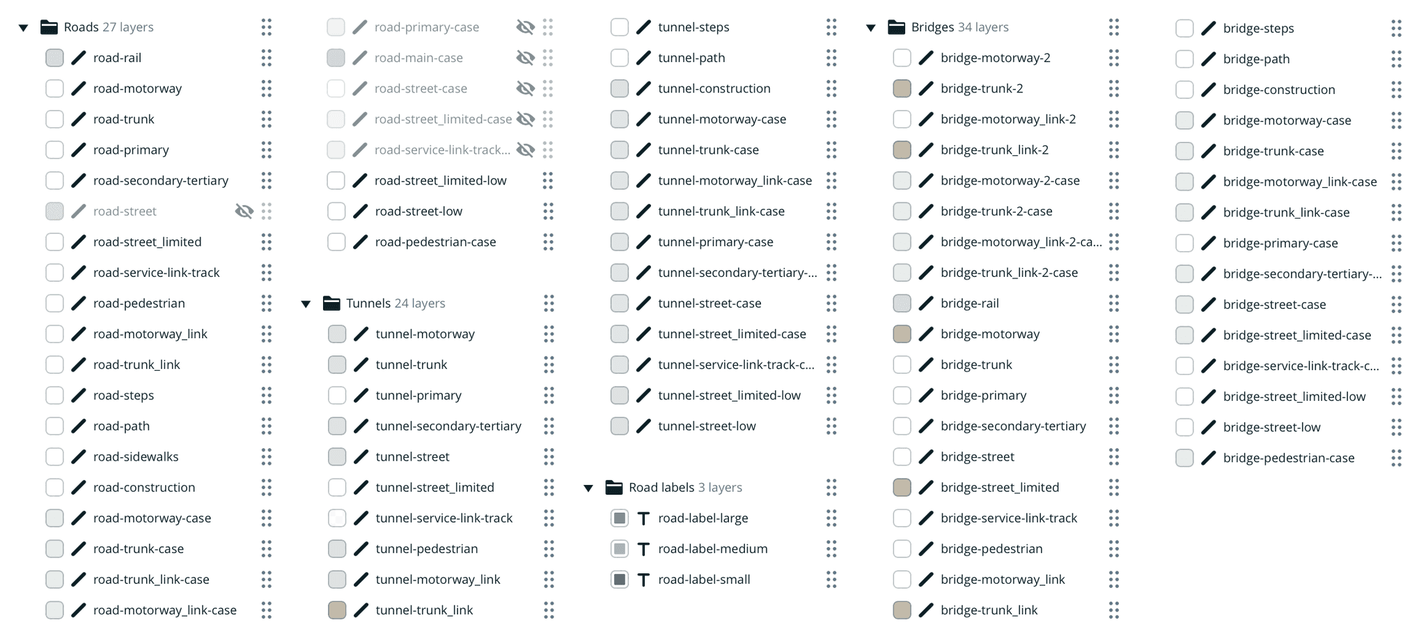 Every sub-map contained 158 layers. I hid many of them to minimize visual noise (some labels, minor roads, admin boundaries, etc.) But there were still a lot of them