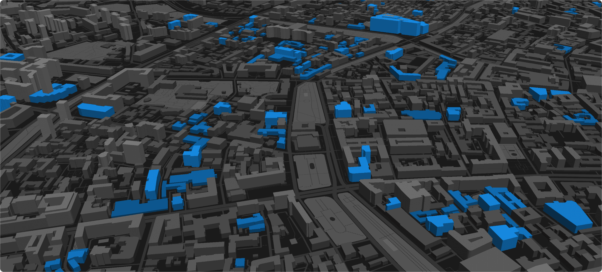 Buildings' pins competed with buildings' silhouettes (it was impossible to highlight a building silhouette, so I had to use pins)